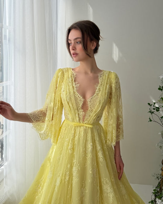 Yellow V-Neck Long Sleeveless A-Line Floor-Length Evening Dress