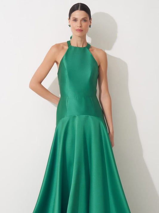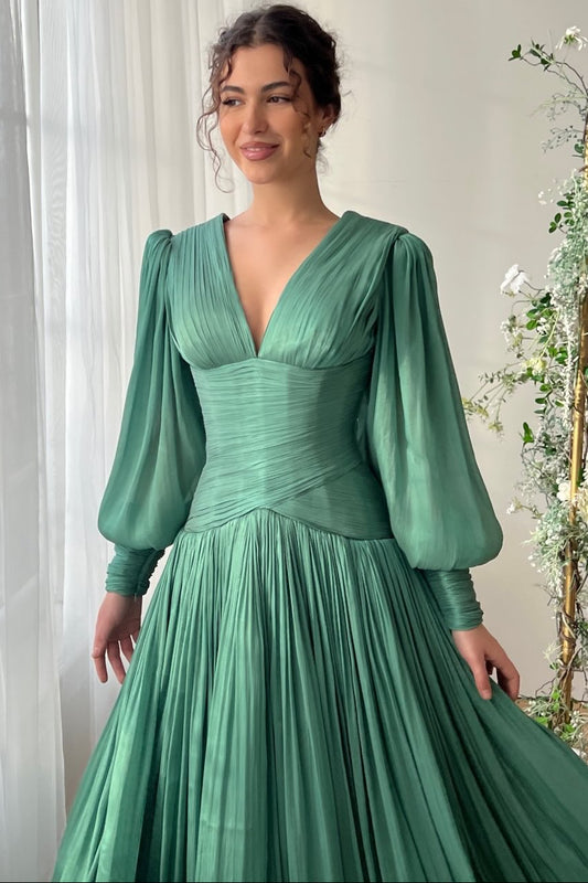Green V-Neck Long Sleeveless A-Line Floor-Length Evening Dress