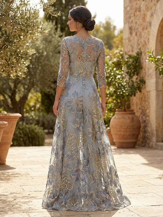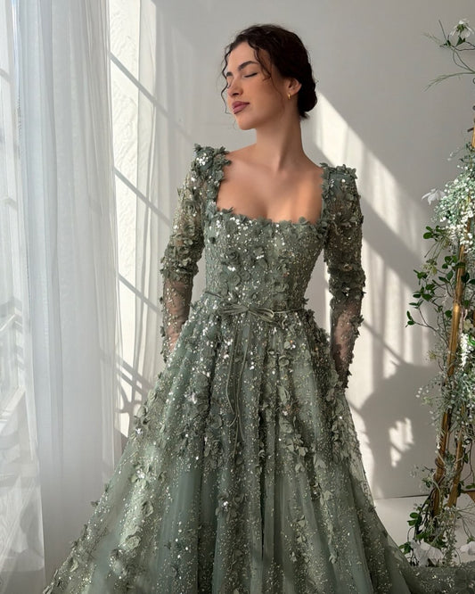 Square Neck Flowers Long Sleeve A-Line Floor-Length Evening Dress