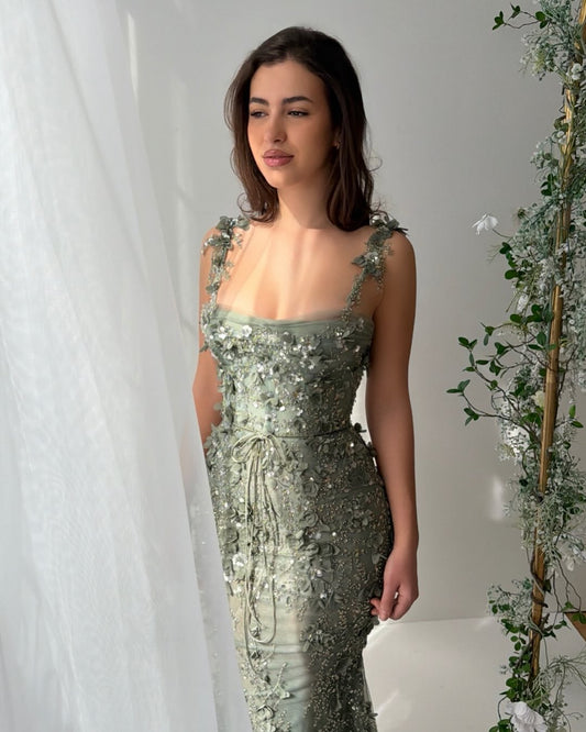 Spaghetti Straps Flowers Sleeveless Flowers Mermaid Evening Dress