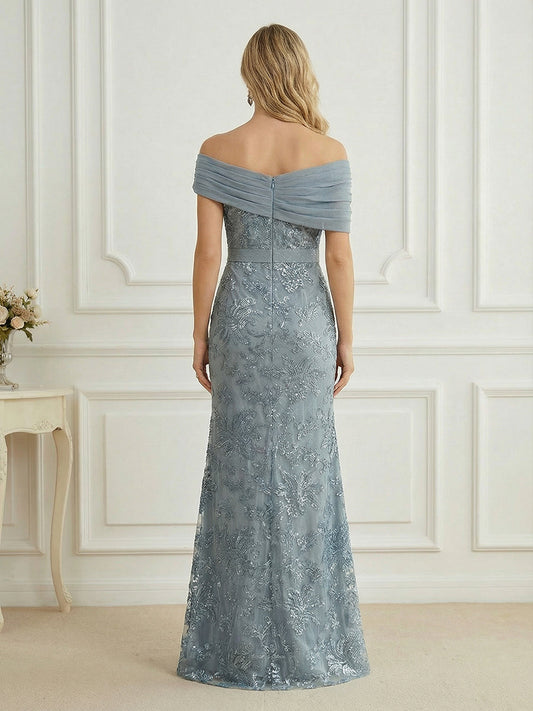Mermaid Off Shoulder Short Sleeve Long Elegant Mother of the Bride Dresses with Sequin