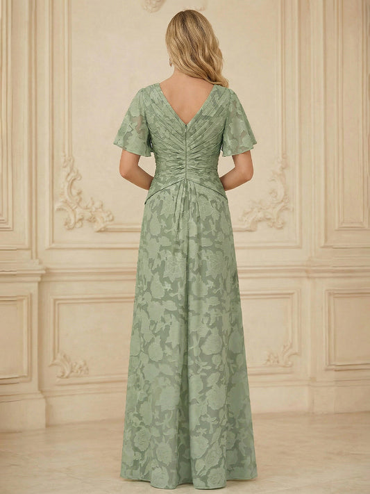 Floral Jacquard A-Line V-Neck Short Sleeve Maxi Mother of the Bride Dresses with 3D Flower