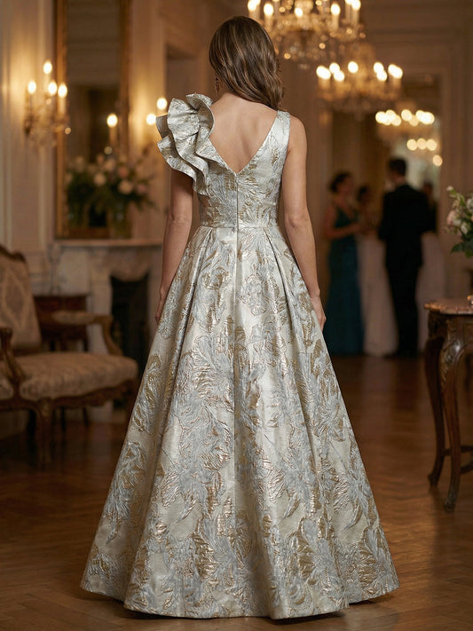 Floral Jacquard A-Line V-Neck Long Evening Dresses with Ruffle Applique