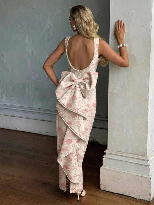 Jacquard Sheath Scoop Neck Ruffle Maxi Evening Party Dress with Pearl