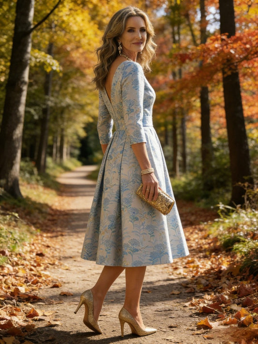 Floral Jacquard 3/4 Sleeves V-Neck Mother of the Bride with Ruched Waist
