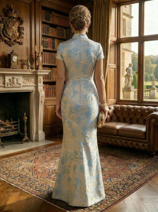 Mermaid Short Sleeve Stand Collar Mother of the Bride Dresses with Jacquard