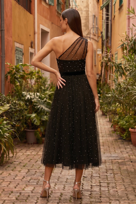 Black One Shoulder Pearl Beaded Midi Ball Evening Dress