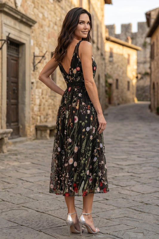 Black V-Neck Sleeveless Flowers Floral Print A-Line Evening Dress
