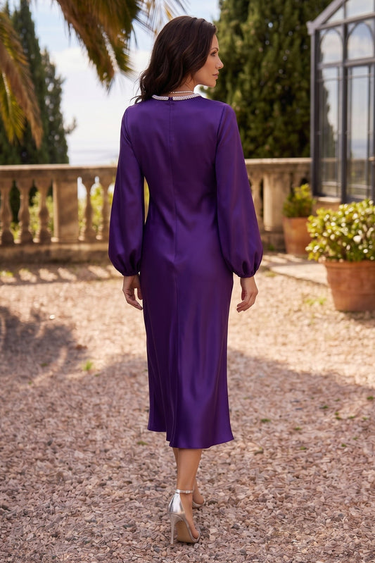 Purple High Neck Long Sleeve Crystal Detail Evening Dress