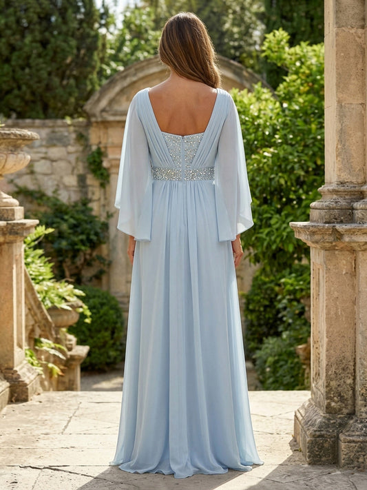 A-Line Chiffon Pleated Long Mother of the Bride with 3/4 Flutter Sleeves Sequin Waist