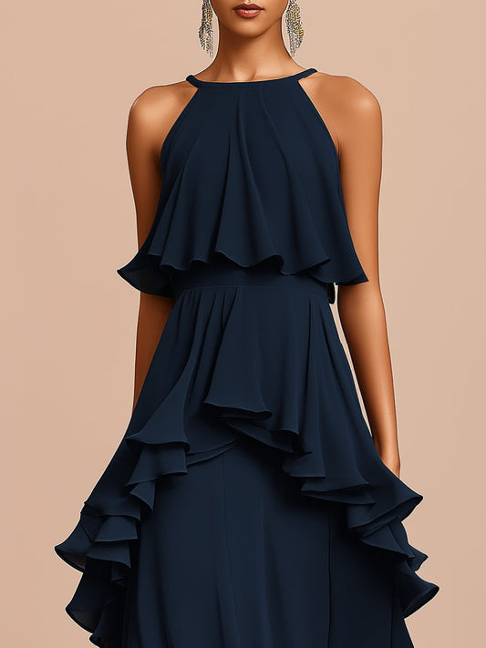 Halter Neck Asymmetric Layered Ruffle Maxi Dress