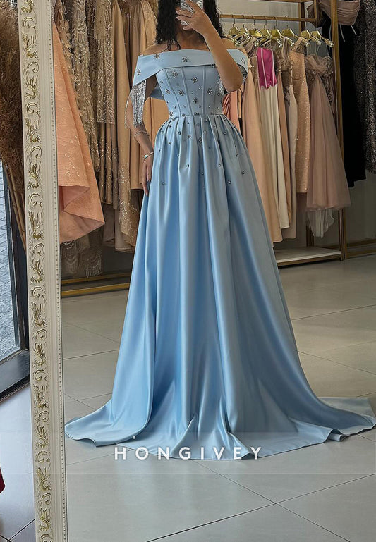 Princess Chapel Train Rhinestone Satin Appliqued Off the Shoulder Evening Gown