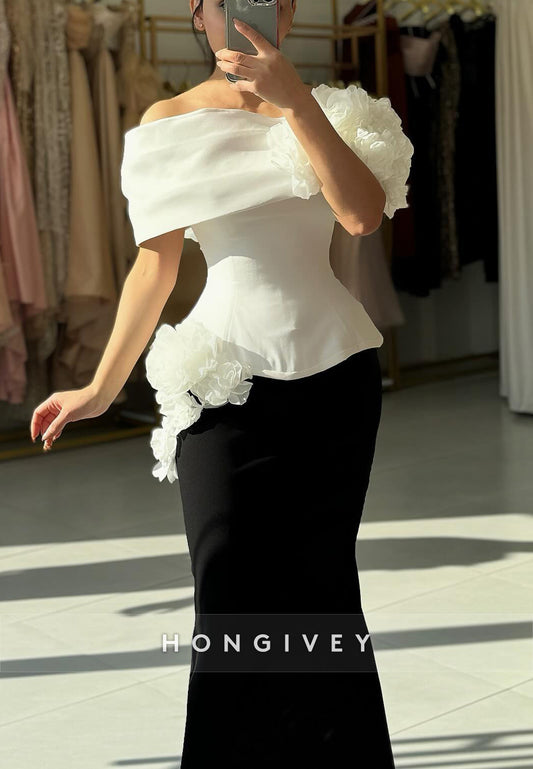 Off the Shoulder Evening Gown Trumpet Court Train Satin Handmade Flowers Pleated