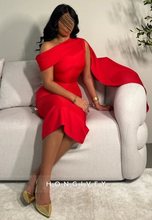 Satin Sheath Watteau TrainKnee-Length One Shoulder Knee-Length Pleated Evening Gown