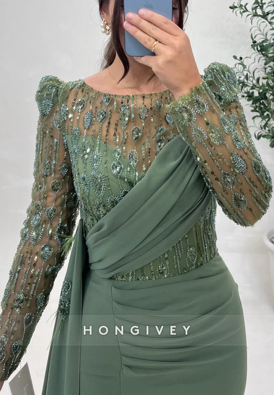 Beaded Floor-Length High Neck Satin Long Sleeve Pleated High Split Evening Gown