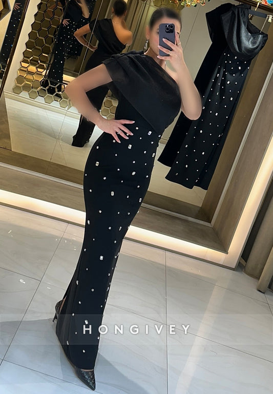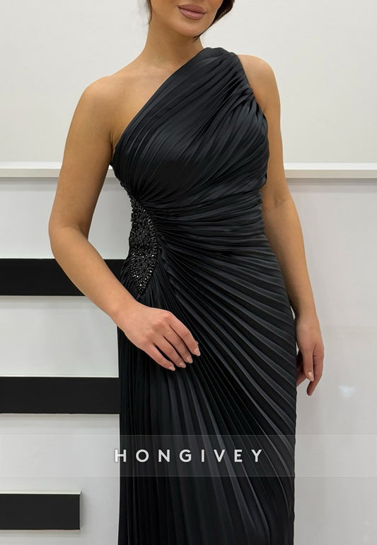 Split Sheath Rhinestone One Shoulder Floor-Length Sleeveless Pleated Evening Gown