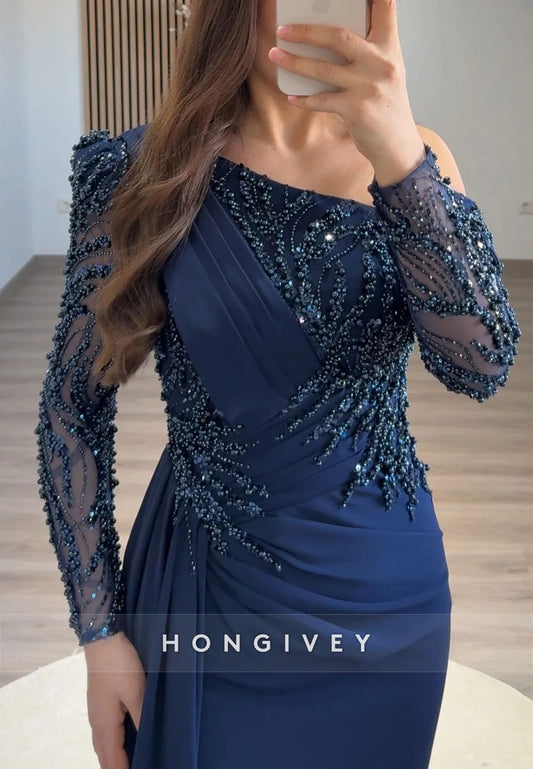 Side Draping Column Evening Gown Floor-Length One Shoulder Long Sleeve Beading Formal Dresses