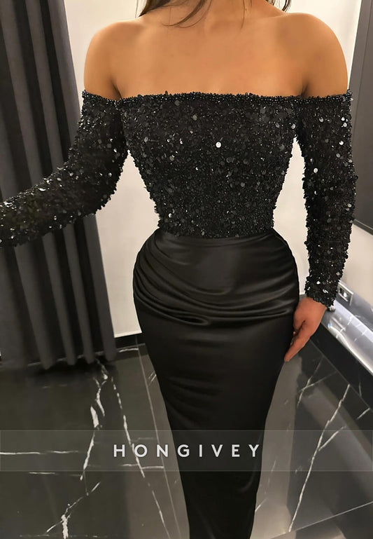 Long Sleeve Floor-Length Sheath Off the Shoulder Satin Pleated Evening Gowns