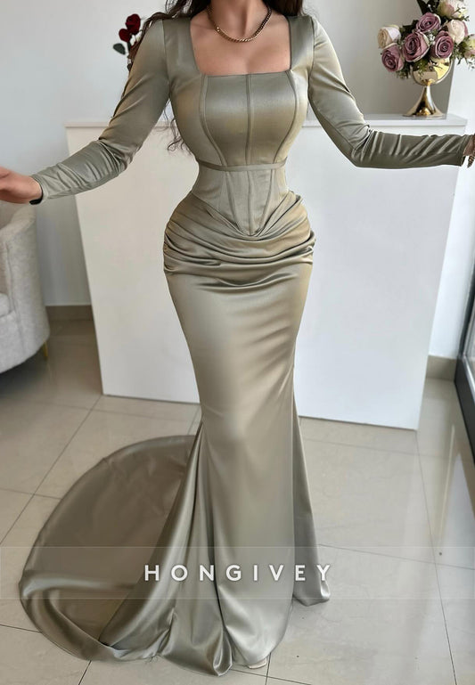 Celadon Pleated Mermaid Court Train Square Satin Long Sleeve Evening Gown