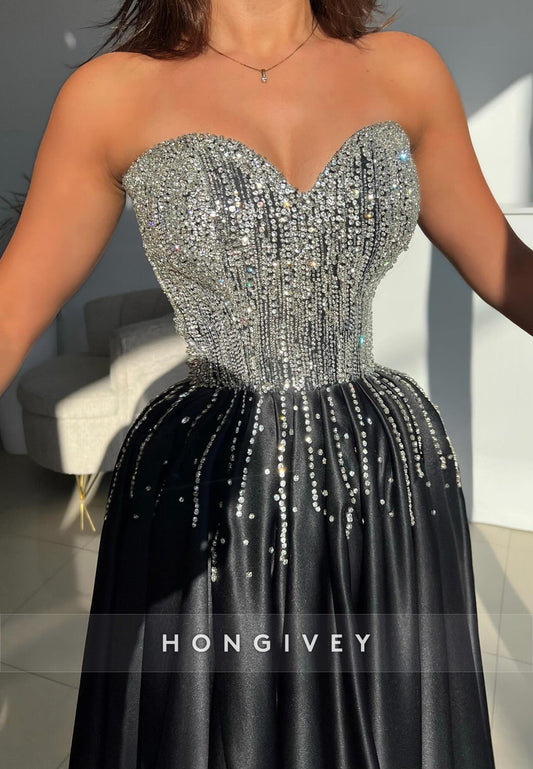 A-line Black Sleeveless Satin Sweetheart Appliqued Crystal Strapless Evening Gowns