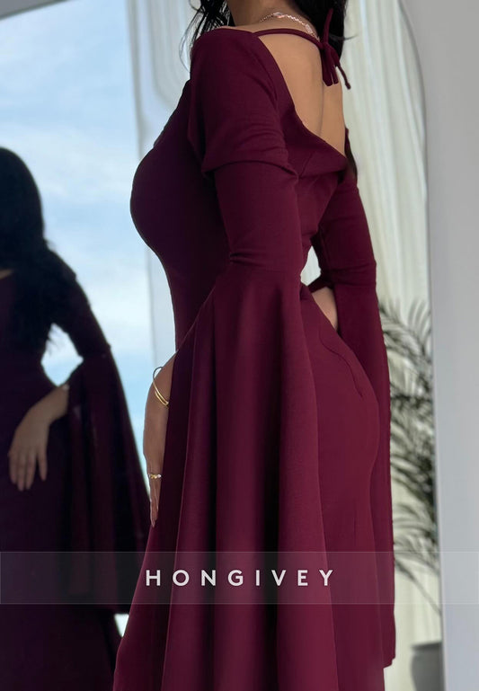 Sheath Ankle-Length Asymmetrical Neck Bell Sleeves Pleated Split Evening Gown