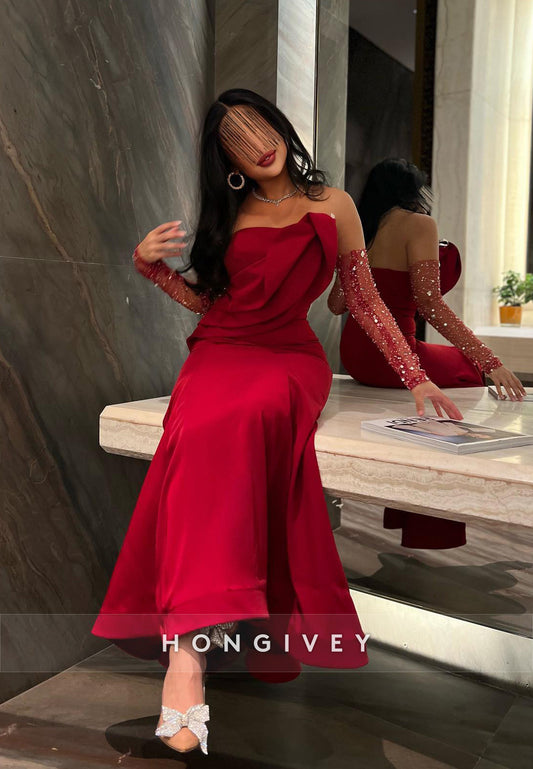 Red Evening Gown Ankle-Length Sleeveless Satin Strapless Mermaid