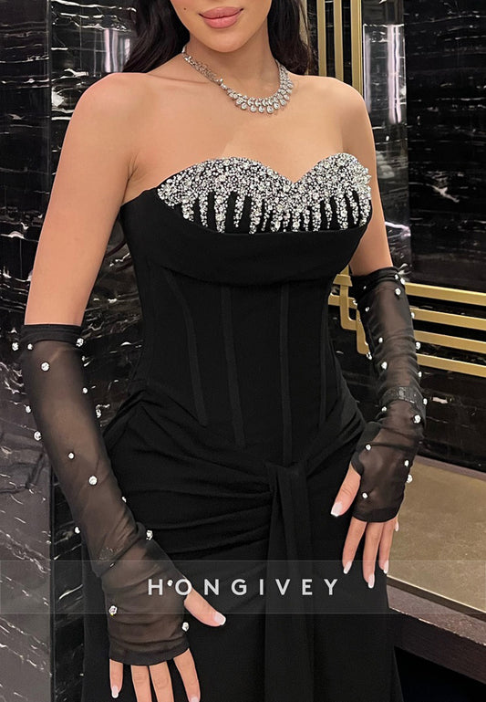 Column Floor-Length Sweetheart Pleated Beaded Rhinestone Evening Gown