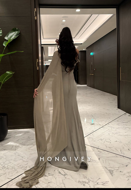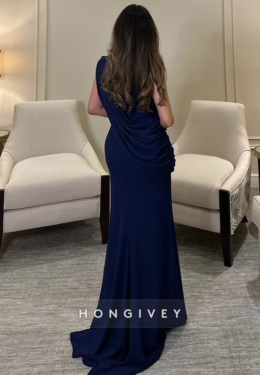 Column Chapel Train One Shoulder Long Sleeve Pleated Slit Evening Gown