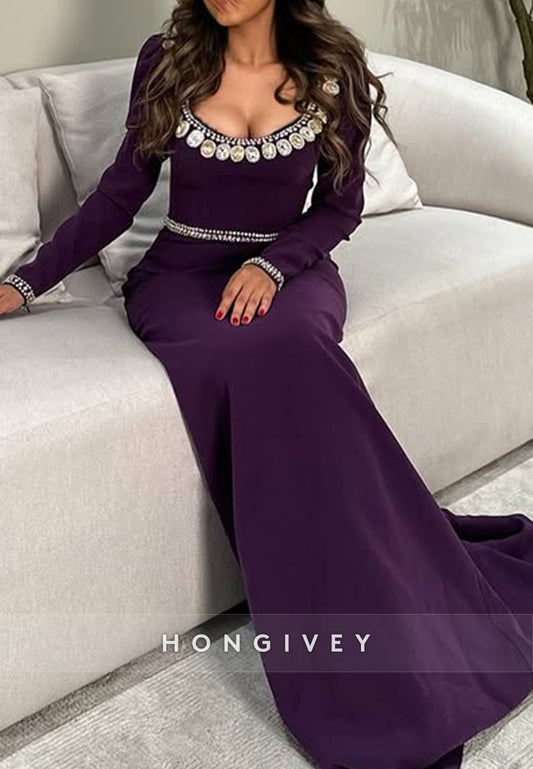 Elegant Rhinestone Evening Gown Court Train Column Scoop Long Sleeve Formal Dresses