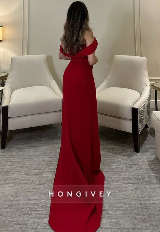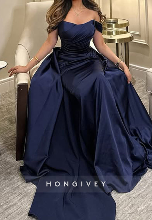 Court Train Sheath Satin Off the Shoulder Pleated Evening Gown