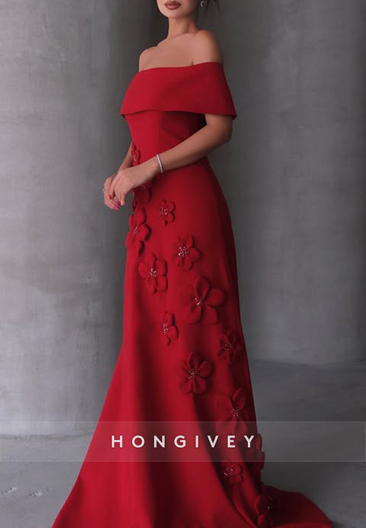 Flowers Appliqued Column Mother of the Bride Dress Handmade Flowers High Slit Floor-Length Off the Shoulder Satin Evening Gown