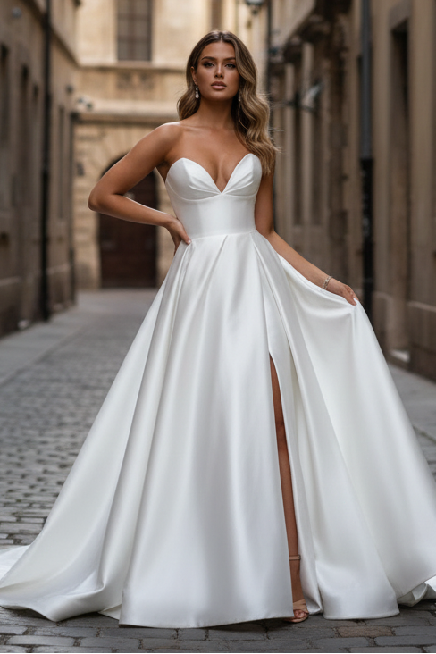 Charming A Line Strapless White Satin Long Wedding Dress with Slit