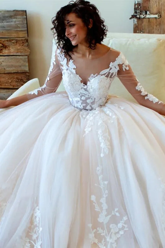 V-Neck Lace Long Sleeve Applique A-Line Floor-Length Wedding Dress
