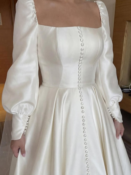 Square Neck Long Sleeve Button A-Line Floor-Length Wedding Dress