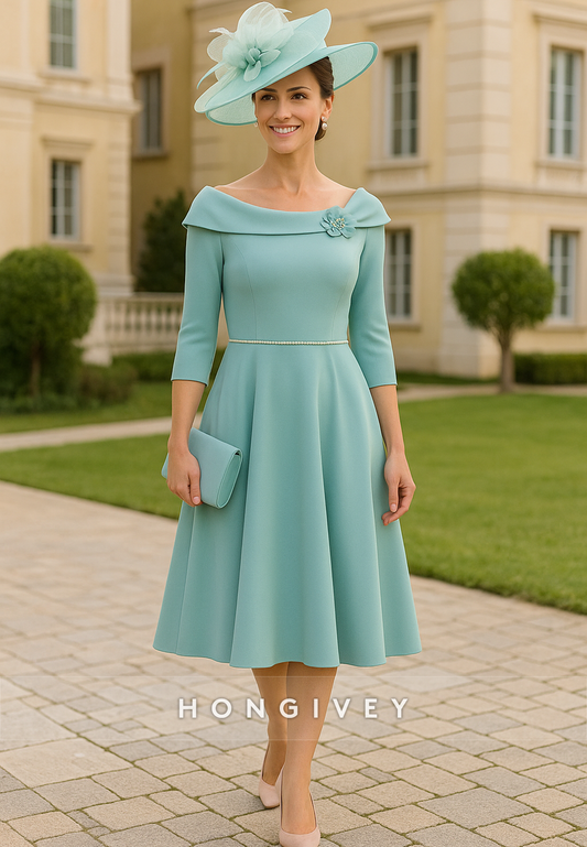 3/4 Sleeve A-Line Tea-Length Pleated Mother of the Bride Dress with Shoulder Beading