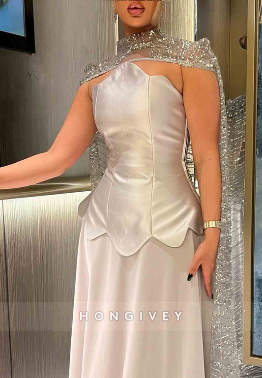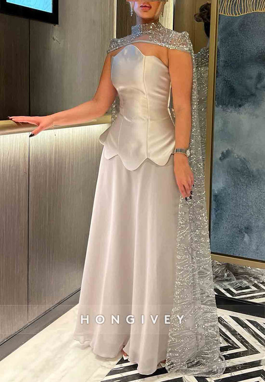 A Line Strapless Chiffon Beaded Corset Long Prom Dress With Slit