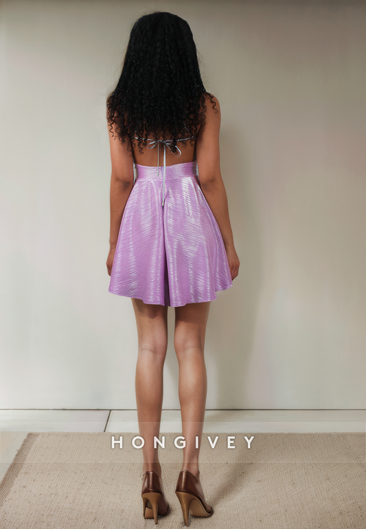 Glitter Fitted V-Neck Spaghetti Straps Lace-Up Short Party Homecoming Dress