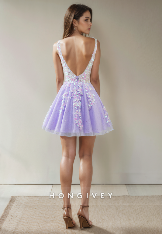 Tulle A-Line V-Neck Appliques Short Party Homecoming Dress