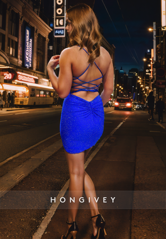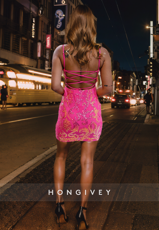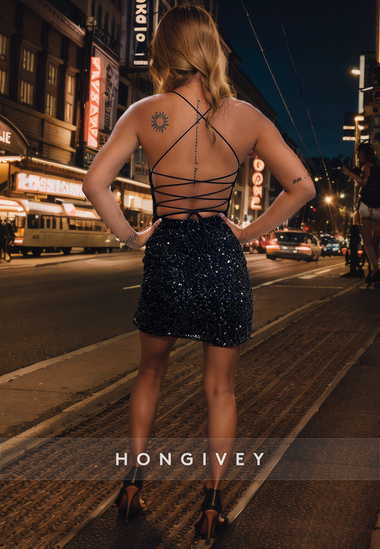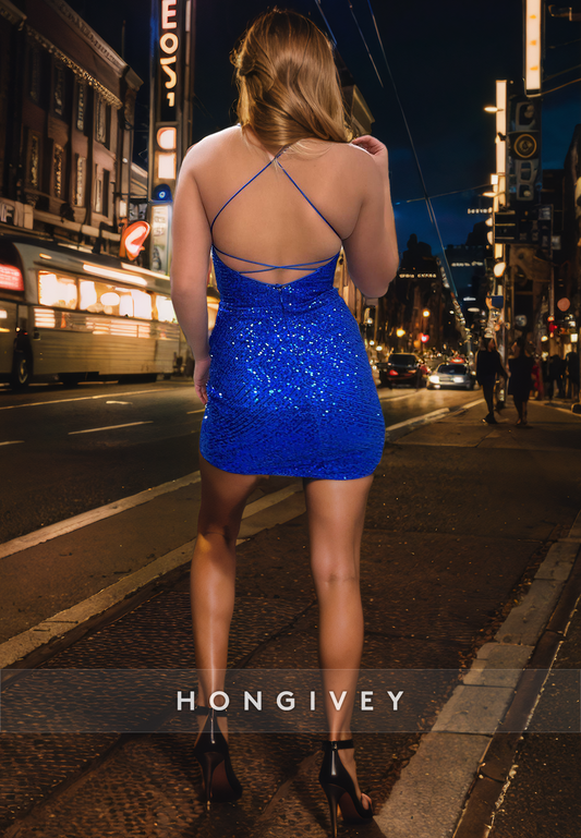 Fitted V-Neck Spaghetti Straps Fully Sequined Lace-Up Short Homecoming Dress