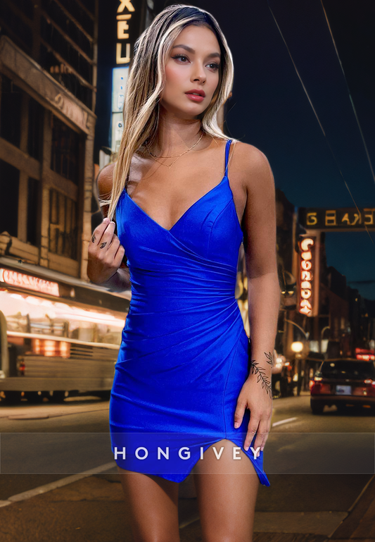 Satin Sheath V-Neck Spaghetti Straps Sleeveless Ruched Short Homecoming Dress