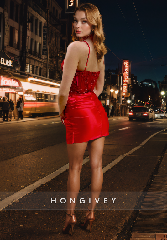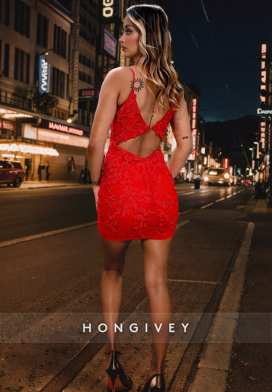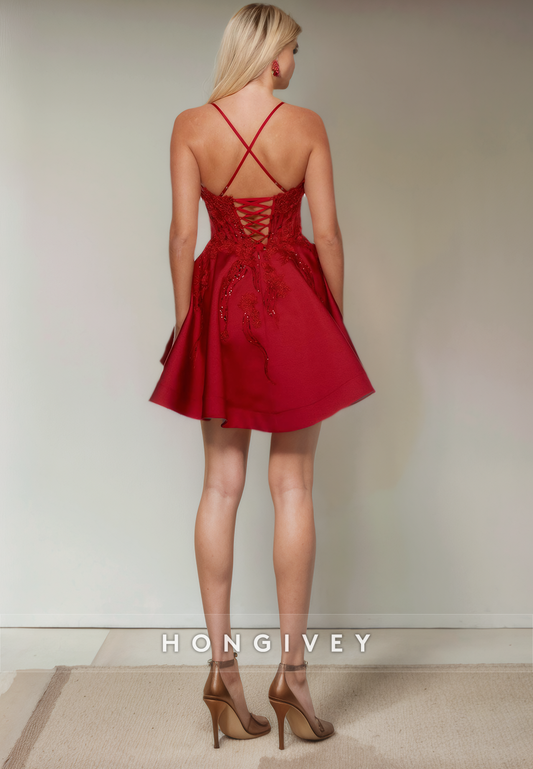 Sheath V-Neck Spaghetti Straps Lace-Up Appliques Short Homecoming Dress
