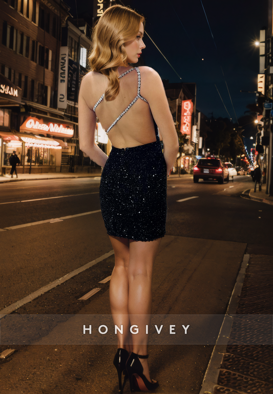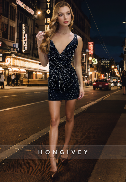 Glitter Fitted V-Neck Sleeveless Sequined Bead-Fringed Short Party Homecoming Dress