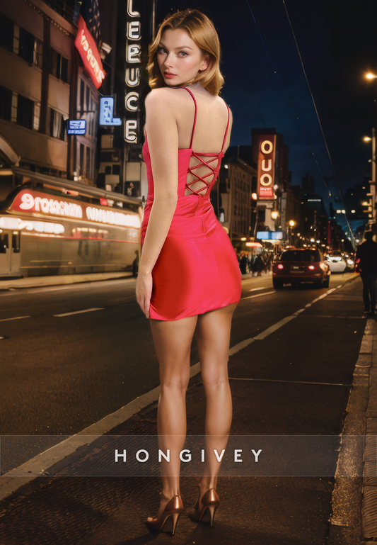Satin Fitted V-Neck Spaghetti Straps Short Party Homecoming Dress