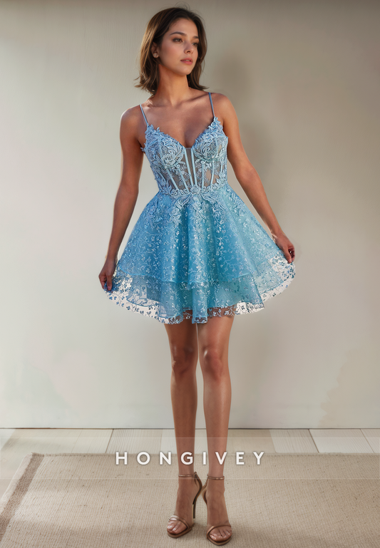 A-Line V-Neck Spaghetti Straps Appliques Short Party Homecoming Dress