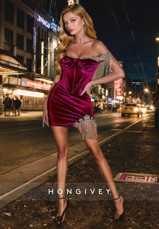 Sheath Sweetheart Off-Shoulder Beaded Fringe Glitter Short Homecoming Dress