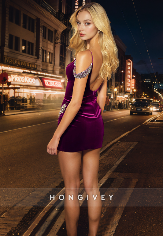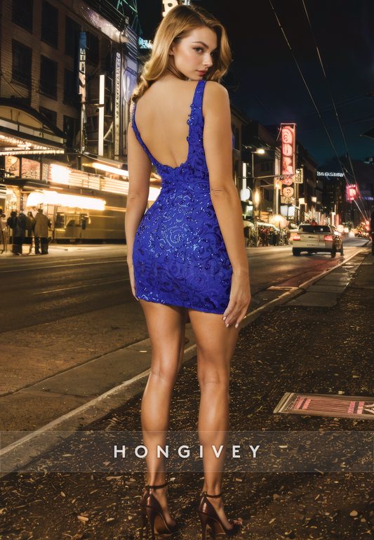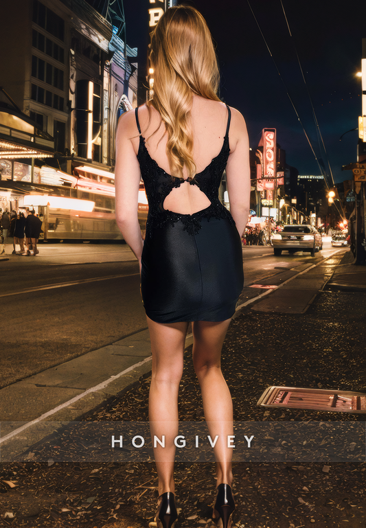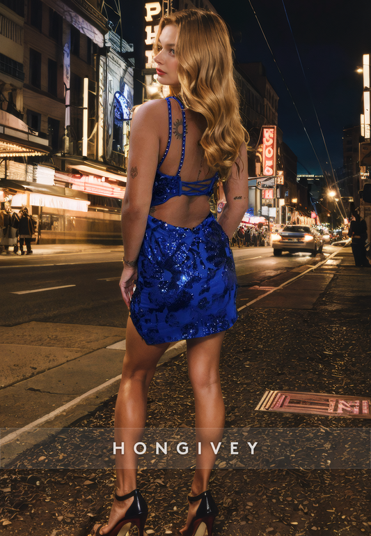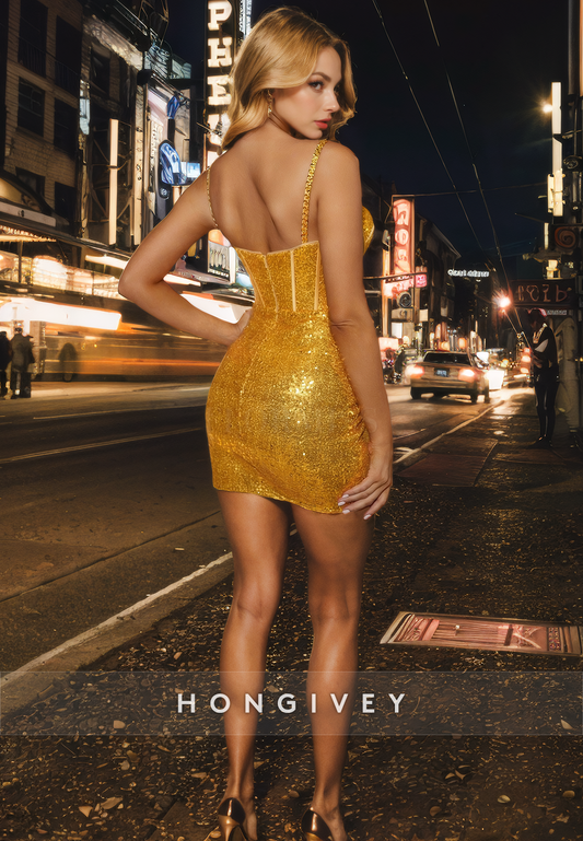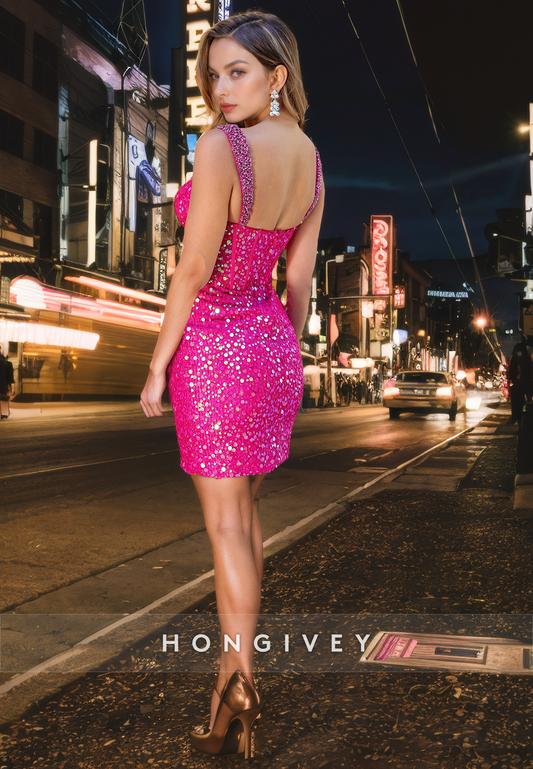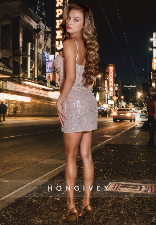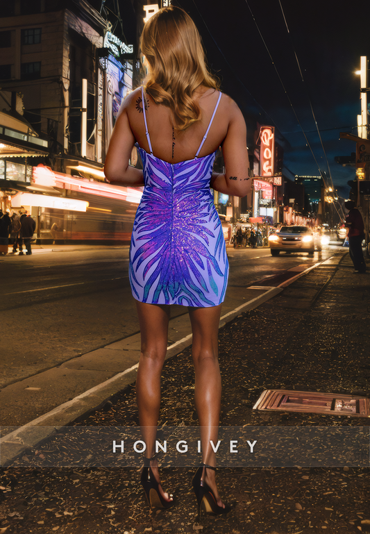 Sexy Fitted V-Neck Spaghetti Straps Sparkly Short Party Homecoming Dress