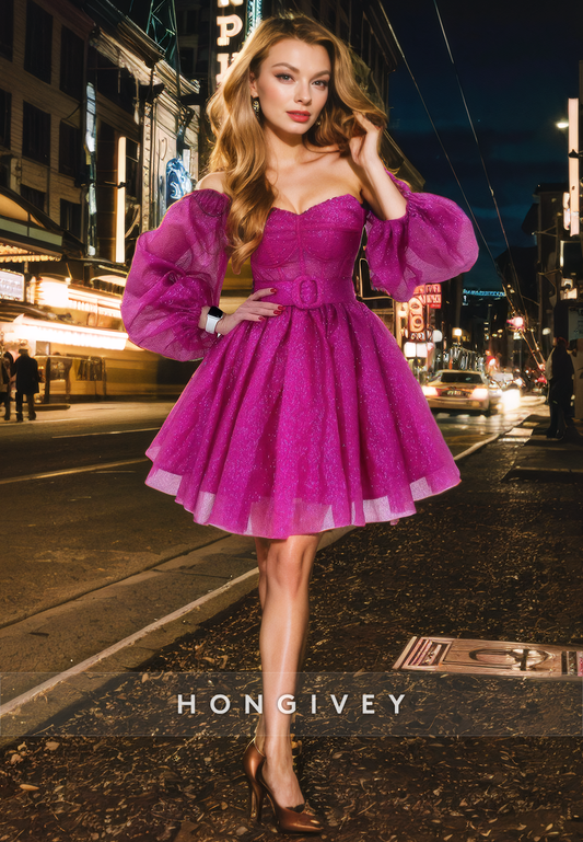 Glitter A-Line Off-Shoulder Long Sleeve Belt Short Homecoming Dress