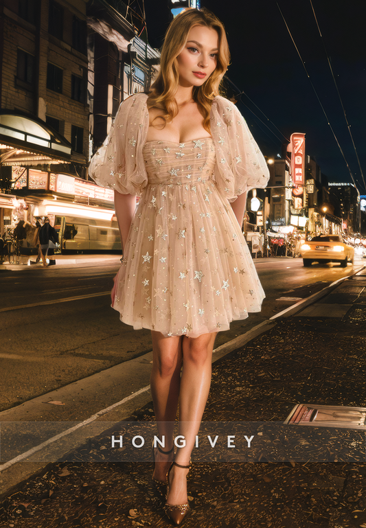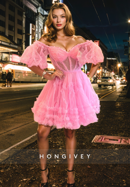 Elegant Tulle A-Line Puff Sleeves Appliques Short Homecoming Dress