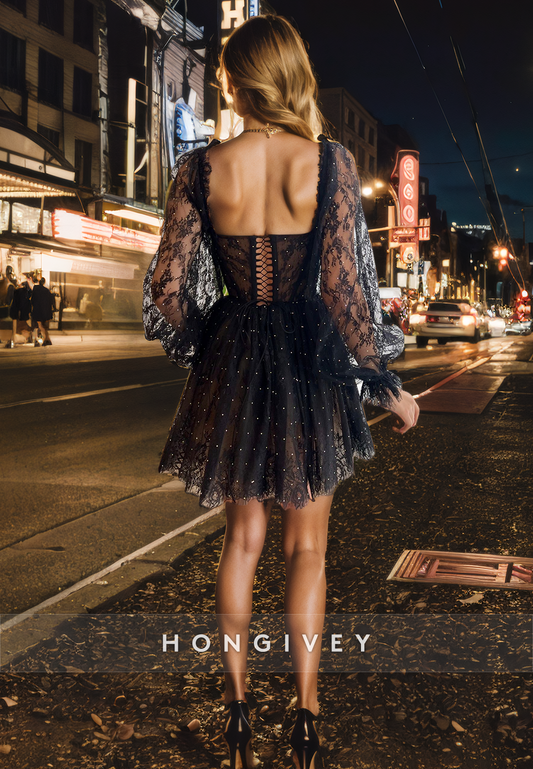 Sweetheart Puff Sleeves Lace Applique Lace-Up Party/Homecoming Dress