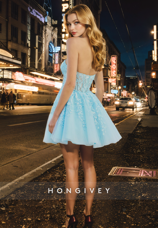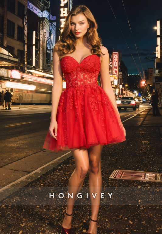 Tulle A-Line Sweetheart Appliques Sheer Short Homecoming Dress